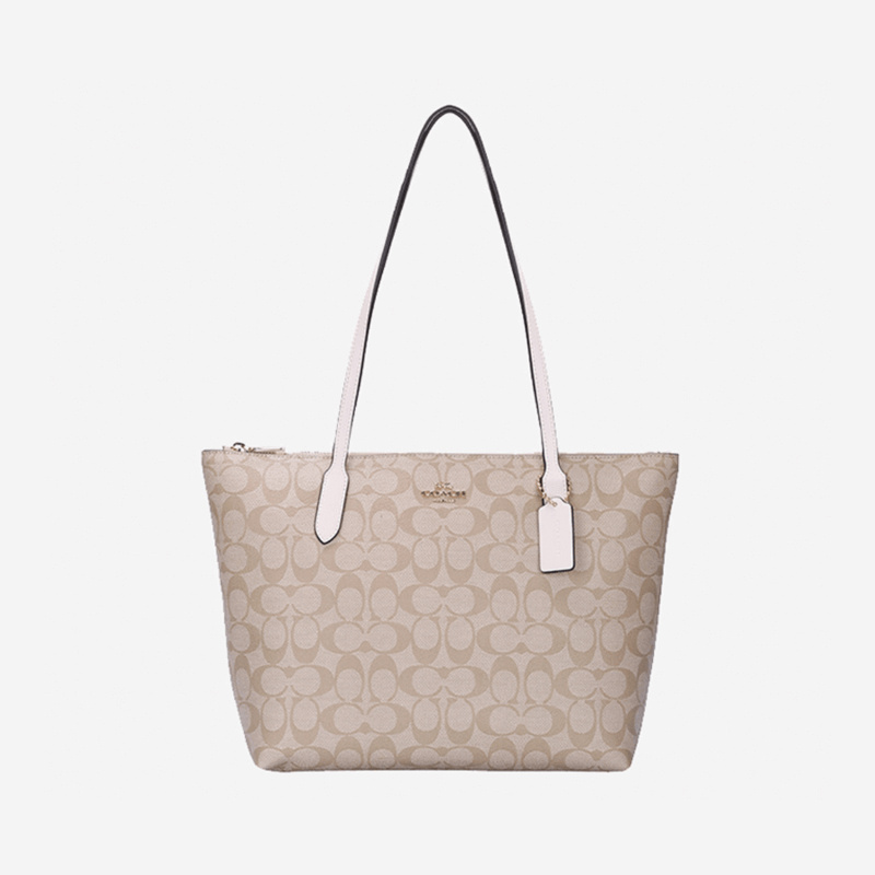 蔻驰(COACH)七夕礼物女士中号手提单肩托特包 卡其白色PVC4455IMDQC